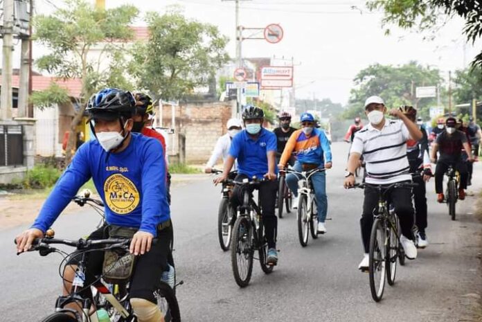 METRO – realitasonline.id | Wali Kota Metro Wahdi dan Wakil Wali Kota Metro Qomaru Zaman melakukan kegiatan bersepeda menuju wisata Padas Grojok di Kelurahan Rejomulyo Metro Selatan, Minggu pagi (14/3/2021).