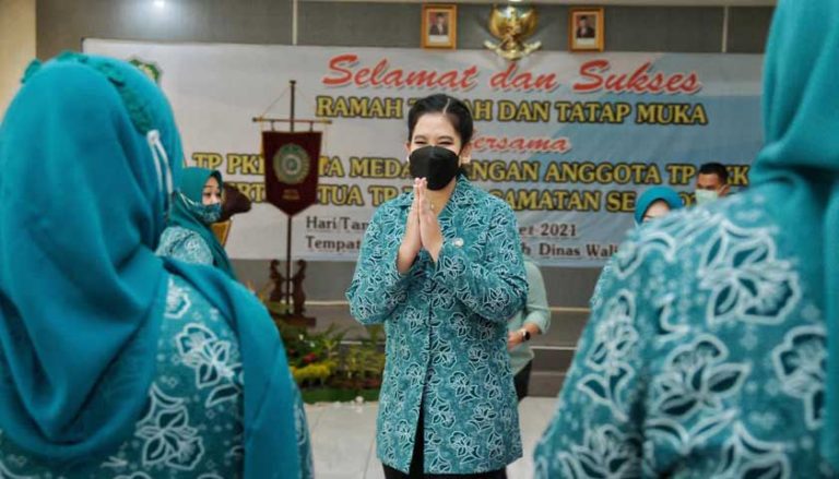 MEDAN – Ketua TP PKK Kota Medan, Ny. Kahiyang Ayu Muhammad Bobby Afif Nasution menghadiri acara ramah tamah dengan seluruh anggota TP PKK Kota Medan, di Pendopo Rumah Dinas Wali Kota Medan, Jumat (5/3/2021).