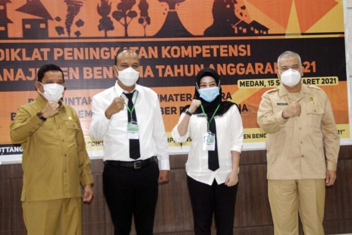 Hal tersebut disampaikan Asisten Administrasi Umum dan Aset M Fitriyus yang mewakili Gubernur Sumut Edy Rahmayadi, saat membuka Diklat Peningkatan Kompetensi Dasar Manajemen Bencana Tahun 2021 di Aula Cemara, Kantor Badan Pengembangan Sumber Daya Manusia (BPSDM) Sumut, Jalan Nalengko Medan, Senin (15/3/2021). Hadir di antaranya Kepala BPSDM Sumut Asren Nasution bersama Komite Penjamin Mutu Prof Zainuddin, BNPB/BPBD, perwakilan BNN Sumut, BKKBN, serta puluhan peserta dari seluruh OPD Pemprov Sumut.