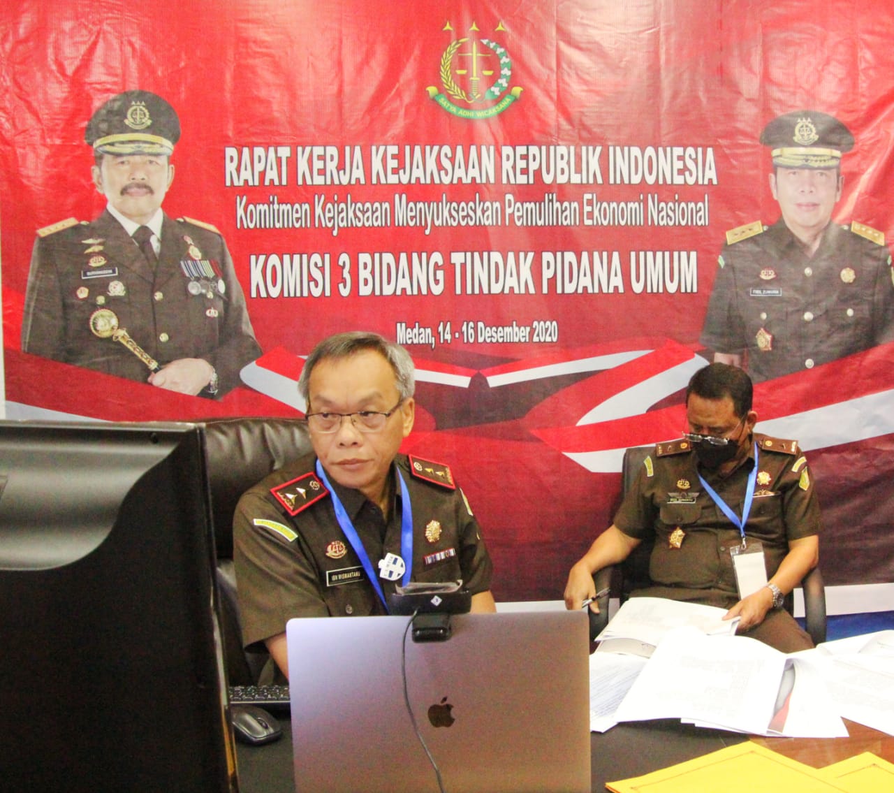 MEDAN-Setelah mengikuti Rapat Kerja Nasional (Rakernas) yang dibuka secara resmi oleh Presiden RI Joko Widodo, Kepala Kejaksaan Tinggi Sumatera Utara (Kajati Sumut) Ida Bagus Nyoman Wiswantanu, hari ini di ruang kerjanya, Selasa (15/12/2020) mengikuti Rakernas Komisi III Bidang Pidana Umum (Pidum) didampingi Aspidum M Sunarto.