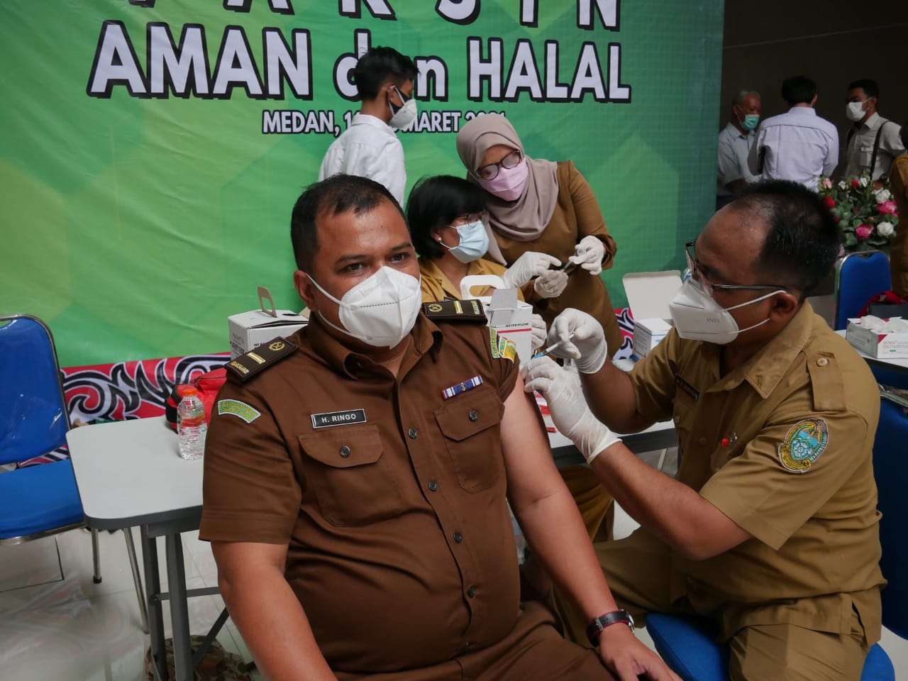 MEDAN-Salah satu upaya yang dilakukan pemerintah untuk memutus mata rantai penyebaran Covid-19 adalah dengan pelaksanaan vaksinasi seperti yang dilakukan Kejaksaan Tinggi Sumatera Utara bersinergi dengan Dinas Kesehatan Provinsi Sumatera Utara. Acara dilaksanakan di lantai 1 Gedung Kejati Sumut Jalan AH Nasutiom, Medan (16/3/2021).