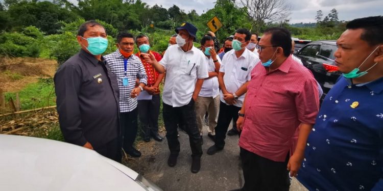 Juga hadir Parlaungan Simangunsong, Ust Syahrul Ependi Siregar, Ari Wibowo, Tangkas Manimpan L Tobing, Dedi, H Wagirin Arman, Jumadi, Bupati Karo Terkelin Brahmana, Kepala Bappeda Karo Ir Nasib Sianturi, Kadis BMBK Sumut Effendi Pohan saat meninjau jalan provinsi jurusan Tongkoh-Sukanalu, Karo, Kamis (16/7/2020).