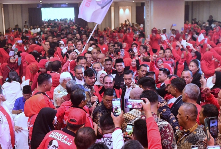 MEDAN – Sebanyak 4.8000 relawan mendeklarasikan mendukung Edy Rahmayadi maju di Pemilihan Gubernur (Pilgub) Sumut tahun 2024. Deklarasi tersebut, digelar Tiara Convention Hall, di Jalan Imam Bonjol, Kota Medan, Jumat sore, 16 Agustus 2024.
