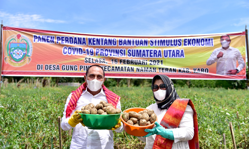 KARO – Panen perdana Gubernur Sumatera Utara (Sumut) Edy Rahmayadi bersama para petani mengambil hasil panen kentang di Desa Gung Pinto, Kecamatan Naman Teran, Kabupaten Karo, Selasa (16/2/2021). Panen kentang ini adalah hasil bantuan program stimulus ekonomi di masa pandemi Covid-19.