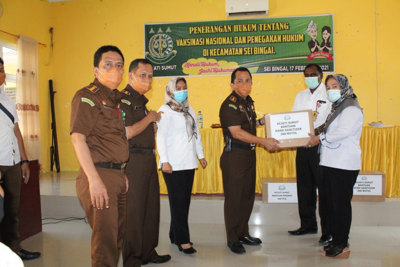 Pada kegiatan tersebut Tim Penerangan Hukum memberi bantuan 500 Pcs Masker dan 300 Botol Hand Sanitizer dan Brosur tentang Vaksinasi yang diterima langsung oleh Camat Sei Bingai Asna Wati S.Sos.