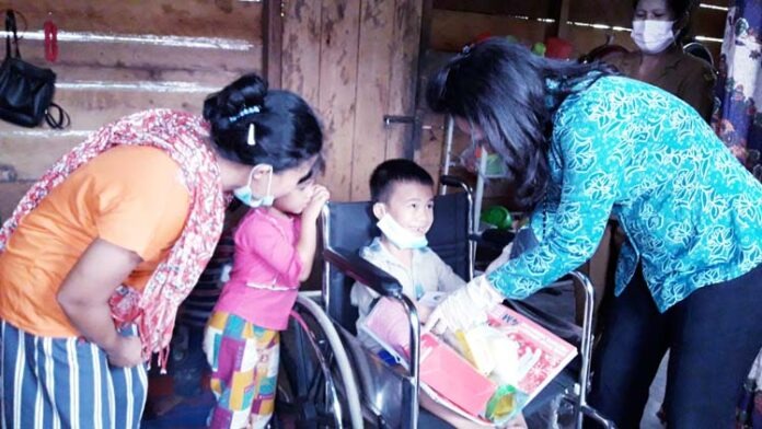 Satika dalam kesempatan itu memberikan semangat dan salut bocah itu masih bisa tersenyum,”Semangat ya nak, doa Bunda agar kau tetap diberikan Tuhan kesehatan,” ucapnya sembari menyerahkan bantuan Sembako berupa Beras, Susu, Gula, Minyak Goreng, Masker, Kalender dan uang tunai.