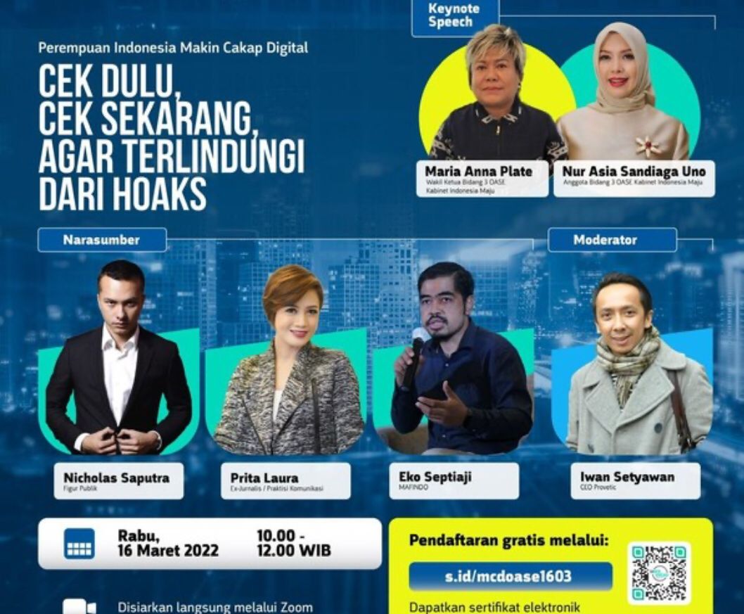 Kegiatan Perempuan Makin Cakap Digital diselenggarakan pada 16 Maret 2022 pukul 10.00 – 12.00 WIB dan mengusung tema “Cek Dulu, Cek Sekarang, Agar Terlindungi Dari Hoaks”.