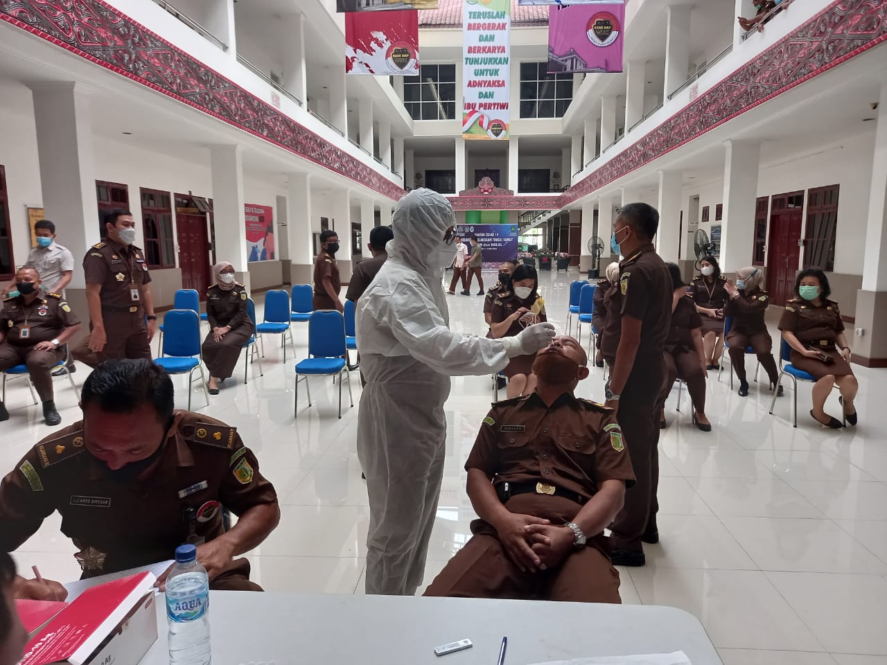 MEDAN-Hari pertama kerja pasca libur Idul Fitri 1442 H, seluruh pegawai Kejaksaan Tinggi Sumatera Utara mulai dari Kajati IBN Wiswantanu, Wakajati Agus Salim, Asintel DR Dwi Setyo Budi Utomo, Aspidum DR Sugeng Riyanta, Aspidsus M Syarifuddin, Asdatun DR Prima Idwan Mariza, Aswas RM Ari Priyoagung, Kabag TU Raden Sudaryono, para Koordinator, Jaksa, Pegawai Tata Usaha, Pengamanan, tenaga honor dan cleaning service langsung mengikuti rapid test antigen di Adhyaksa Hall, Kejati Sumut Jalan AH Nasution Medan, Senin (17/5/2021).