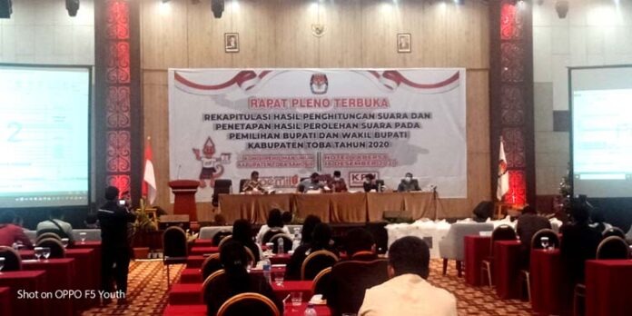 BALIGE – realitasonline.id | Komisi Pemilihan Umum Daerah (KPUD ) Kabupaten Toba menggelar rapat pleno terbuka rekapitulasi hasil penghitungan suara dan penetapan hasil perolehan suara pada pemilihan Bupati dan Wakil Bupati Kabupaten Toba tahun 2020, di Convention Hall Labersa Hotel Balige, Rabu (16/12/2020).