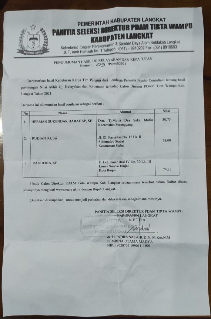 “Serta berdasarkan hasil keputusan ketua tim penguji dari lembaga Permata Psycho Consultant, tentang perhitungan nilai akhir uji kelayakan dan kepatutan terhadap calon Direktur PDAM Tirta Wampu Kabupaten Langkat tahun 2021,”tambahnya.