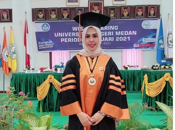 Istri Kombes Ilsarudij ini di wisuda Doktoralnya  secara daring di Kampus Unimed, Selasa (17/2/2021).