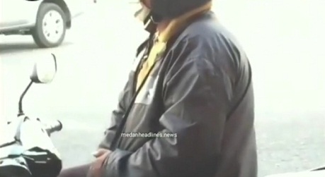 Seorang pria di atas sepeda motor dengan mengenakan jaket dan helm memperlihatkan kemaluannya di Jalan Brigjen Katamso, Medan.