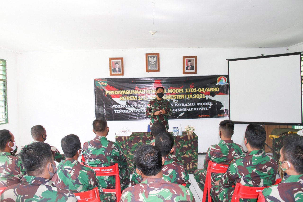 ABEPURA-Korem 172/PWY menggelar kegiatan pendayagunaan Koramil Model semester I tahun anggaran 2021 di Makoramil 1701-14/Arso, Kamis (17/06/2021). Kegiatan tersebut diikuti sebanyak 50  peserta yang terdiri dari para Babinsa dari Kodim jajaran Korem 172/PWY.