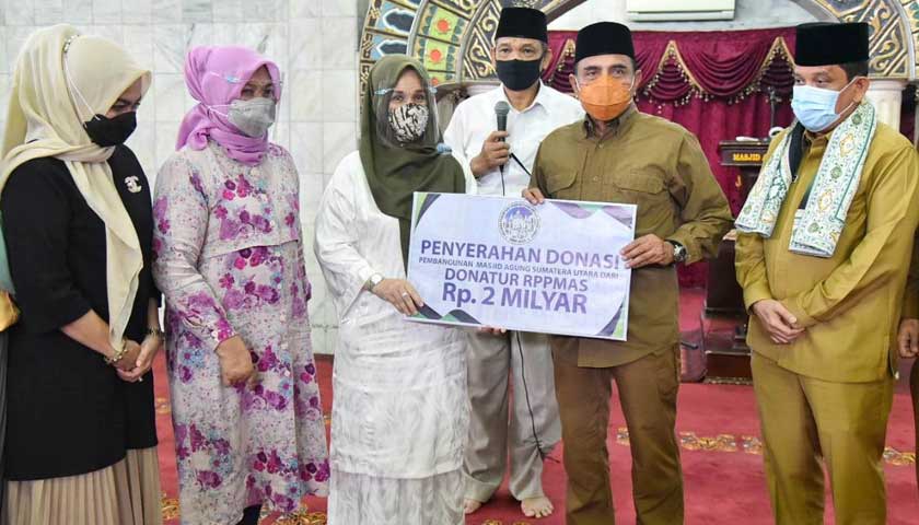 MEDAN – Gubernur Sumatera Utara (Sumut) Edy Rahmayadi yang juga Ketua Umum Panitia Pembangunan Masjid Agung Sumut menerima donasi Rp2 miliar dari Relawan Perempuan Pembangunan Masjid Agung Sumut (RPPMAS), Selasa (18/8/2020), di Masjid Agung di Jalan Pangeran Diponegoro Medan. Donasi ini diharapkan dapat mempercepat pembangunan masjid yang menjadi kebanggaan masyarakat Sumut ini.
