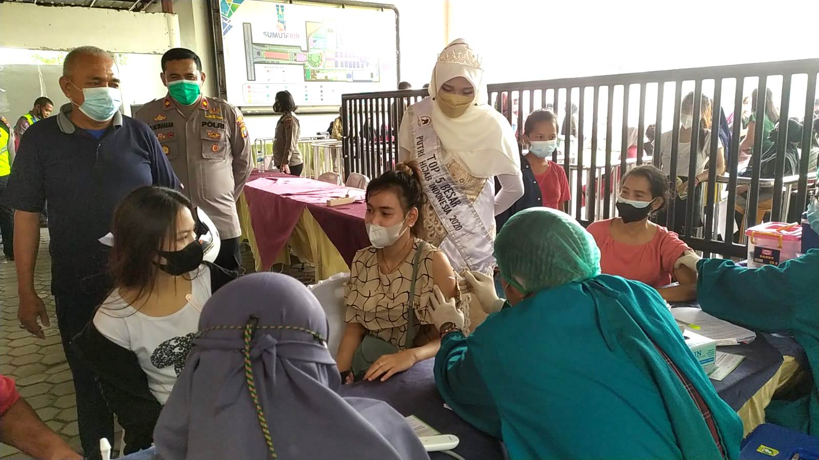 MEDAN – Kegiatan Vaksin Merdeka yang digelar Polrestabes Medan di Pekan Raya Sumatera Utara (PRSU) Jalan Gatot Subroto di wilayah hukum Polsek Helvetia pada Sabtu (18/9/2021) sedikit berbeda dari biasanya. Hal ini disebabkan kehadiran wanita cantik penyandang gelar Putri Hijab Indonesia 2020 Top 5 dan Putri Persahabatan Putri Hijab 2020, Rahayu Pratiwi.