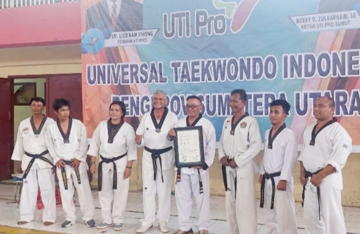 MEDAN – Ketua Universal Taekwondo Indonesia Profesional (UTI-Pro) Sumatera Utara, Bobby O Zulkarnain, menerima sertifikat penghargaan Dan 2 Kukkiwon yang diserahkan Master Rejeki Karo-karo (Dan 6 Kukkiwon).