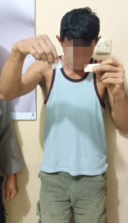 Dari tersangka turut disita barang bukti, 1 kotak warna putih yang berisikan 4 lembar plastik klip transparan yang berisikan butiran kristal warna putih yang diduga narkotika Sabu dan 2 lembar plastik klip transparan kosong.