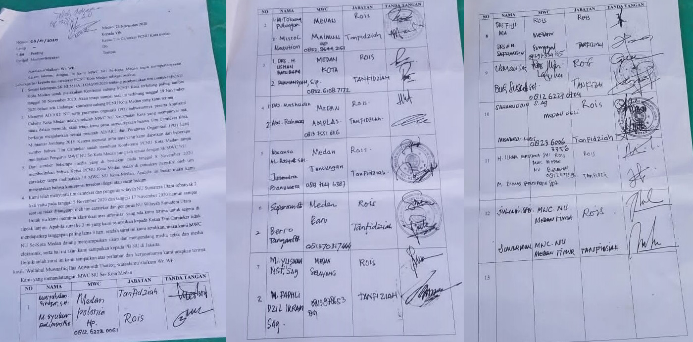 Dalam surat 13 MWC di Kota Medan bernomor 03/ XI/2020 tertanggal 23 November 2020 yang diterima poskotasumatera.com, Rabu (16/12/2020) dijelaskan, awalnya Pengurus PCNU Medan dibekukan dan dibentuk Careteker diketuai Dr Ibnu Affan SH MHum yang diamanatkan menyelenggarakan Konfercab PCNU Medan paling lambat 30 November 2020.