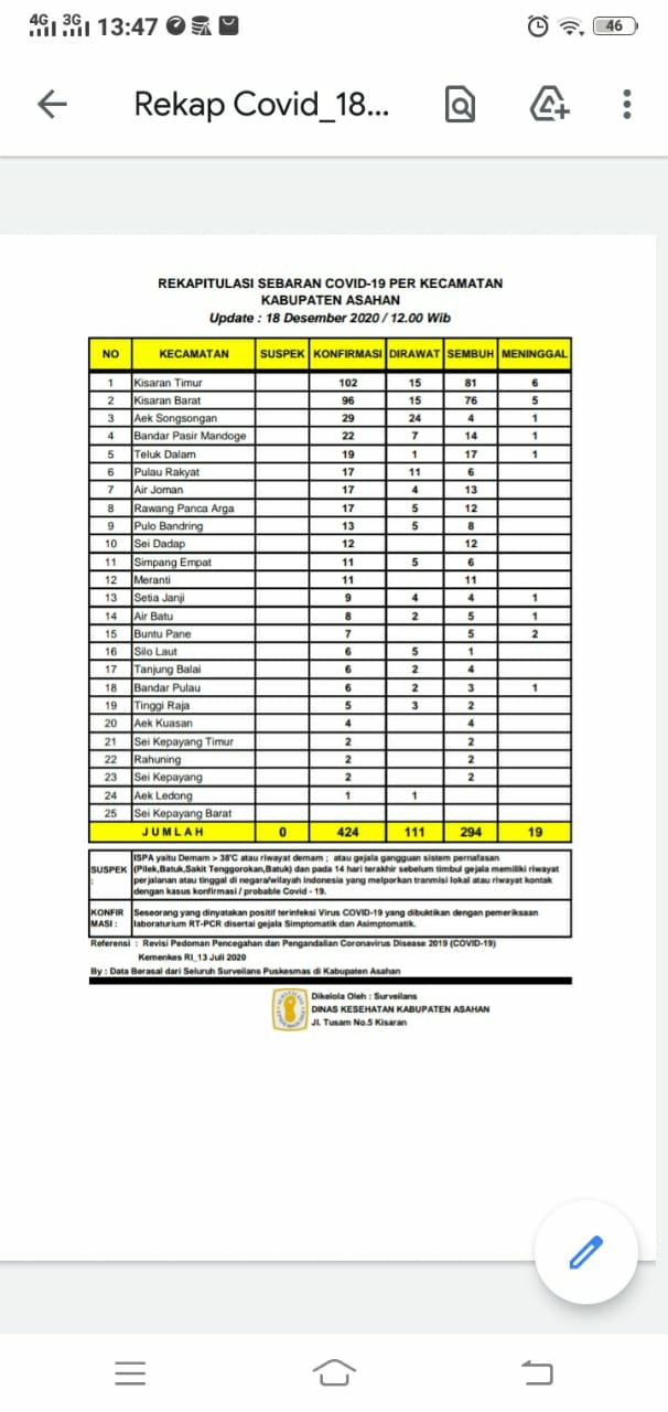Data Update tersebut dipaparkan juru Bicara gugus tugas percepatan Penanganan Covid – 19 Kabupaten Asahan H. Rahmat Hidayat Siregar. Berdasarkan hasil data dari seluruh puskesmas yang ada di wilayah Kabupaten Asahan sebagaimana di kelola Dinas Kesehatan Kabupaten Asahan 18 Desember 2020 hingga pukul 12.00 WIB, Jumat (18/12/2020) melalui group media sosial WhatsApp.
