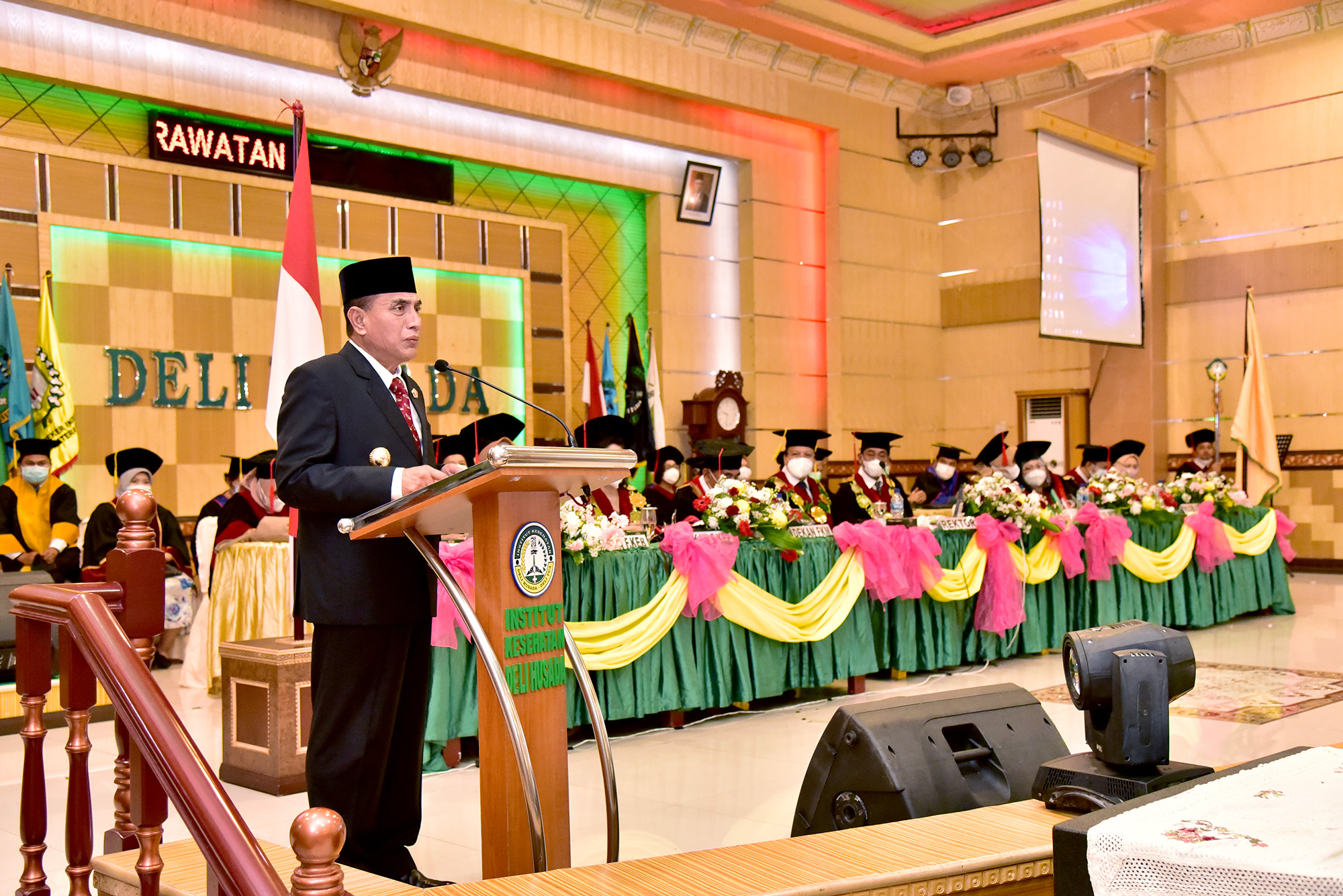 MEDAN – Gubernur Sumatera Utara (Sumut) Edy Rahmayadi menghadiri secara langsung acara wisuda Institut Deli Husada Delitua Tahun Akademik 2019/2020, Selasa (19/1). Edy Rahmayadi mengingatkan wisuda merupakan langkah awal dalam menuntut ilmu yang lebih dalam.