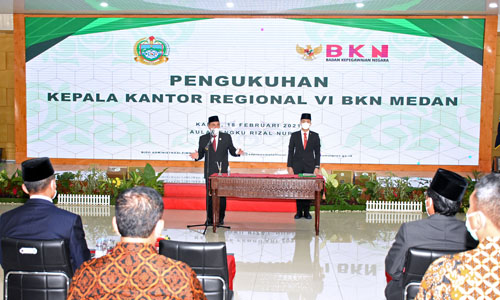 MEDAN, 18/2 – Gubernur Sumatera Utara (Sumut) Edy Rahmayadi mengukuhkan Kepala Kantor Regional (Kanreg) VI Badan Kepegawaian Negara (BKN) Medan Aidu Tauhid, di Aula Tengku Rizal Nurdin, Jalan Jenderal Sudirman 41 Medan, Kamis (18/2).