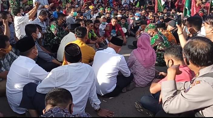 PADANGSIDIMPUAN – Pimpinan dan anggota Dewan Perwakilan Rakyat Daerah (DPRD) Kota Padangsidimpuan bersama Kapolres Padangsidimpuan AKBP. Juliani Prihartini, SIK, MH dan Dandim 0212/TS Letkol Inf Rooy Chandra Sihombing, SIP, sambut ratusan mahasiswa yang melakukan aksi damai penolakan Undang-Undang Omnibus Law Cipta Kerja dengan duduk bersama di jalan raya depan Kantor DPRD Kota Padangsidimpuan, Jum,at (16/10/2020)