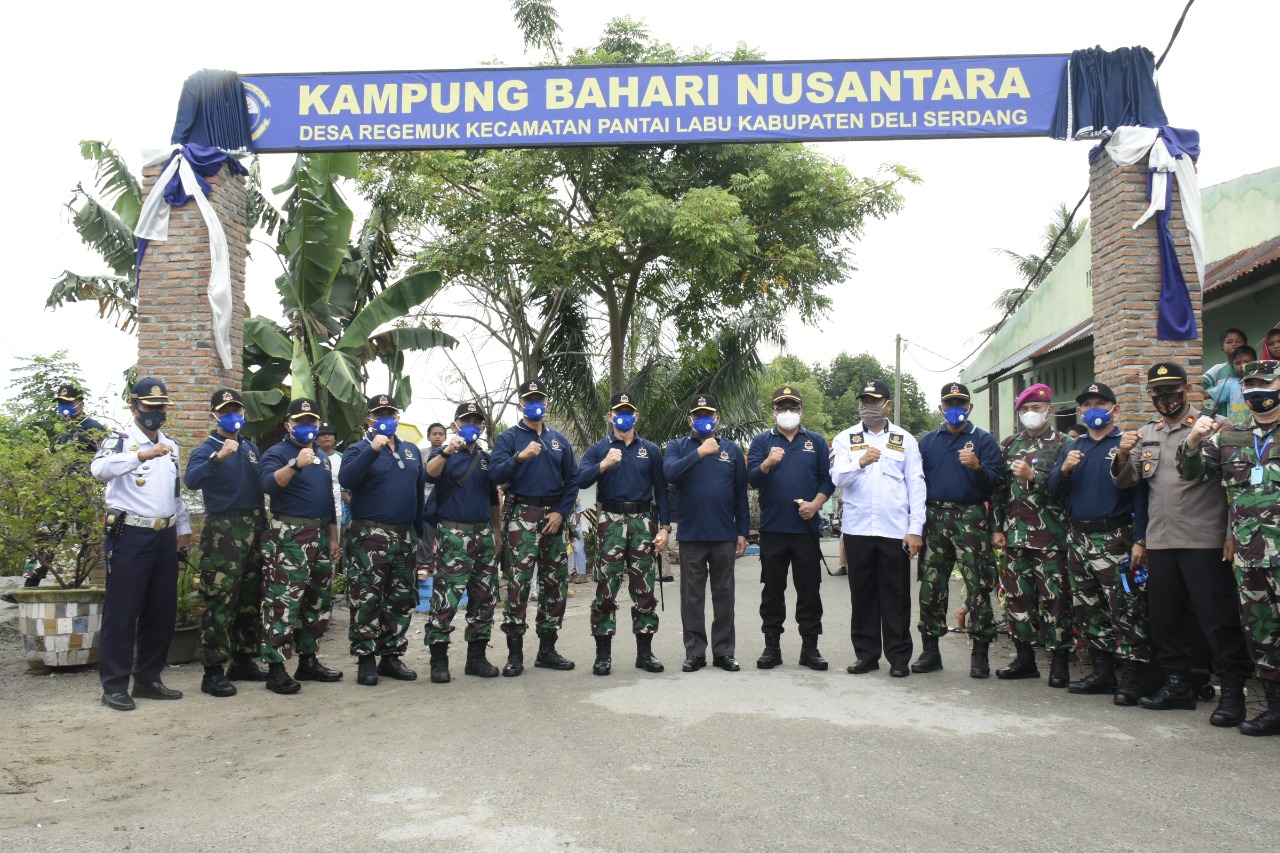 PANTAI LABU-Komandan Pangkalan Utama TNI Angkatan Laut I (Danlantamal I) Brigjen TNI (Mar) I Made Wahyu Santoso menggunting pita yang direntangkan di Gapura pintu masuk menuju Desa Rugemuk. Ini sebagai tanda diresmikannya Desa Rugemuk Kecamatan Pantai Labu Kabupaten Deliserdang, Sumatera Utara menjadi Kampung Bahari Nusantara.