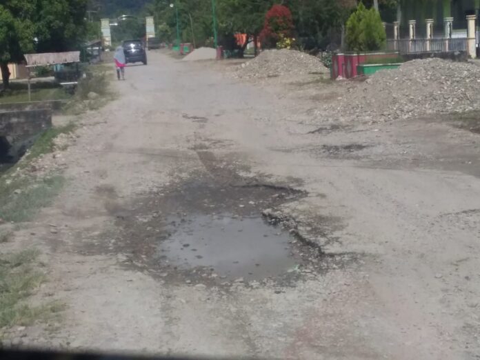 “Kondisinya sekarang pada padan jalan tersebut dihiasi dengan lobang menganga dan mengundang kecelakaan pengguna jalan dan musim kemarau, perumahan penduduk dimasuki debu yang beterbangan”.