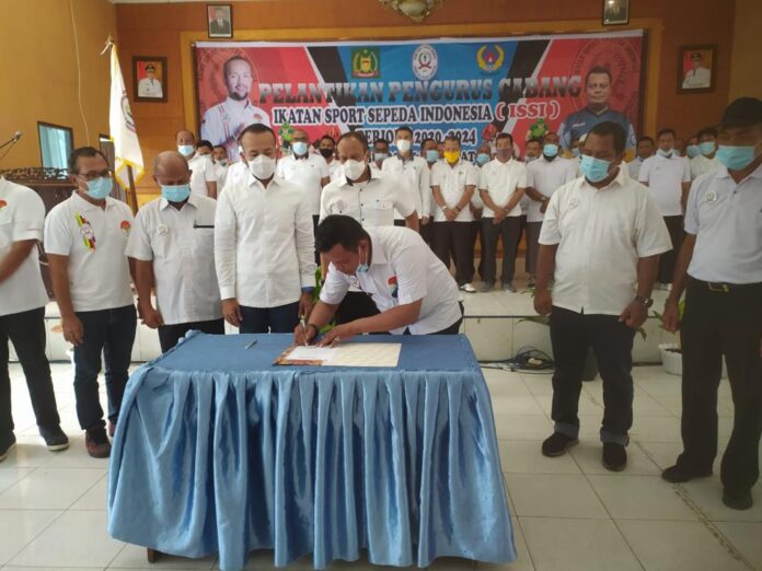 STABAT – realitasonline.id | Bupati Langkat Terbit Rencana PA melalui Asisten II Ekbang H.Hermansyah, secara langsung meyaksikan pelantikan pengurus Ikatan Sepeda Sport Indonesia (ISSI) Kabupaten Langkat periode 2020 – 2024, Gedung PKK Langkat, Stabat, Kamis (12/17/2020).