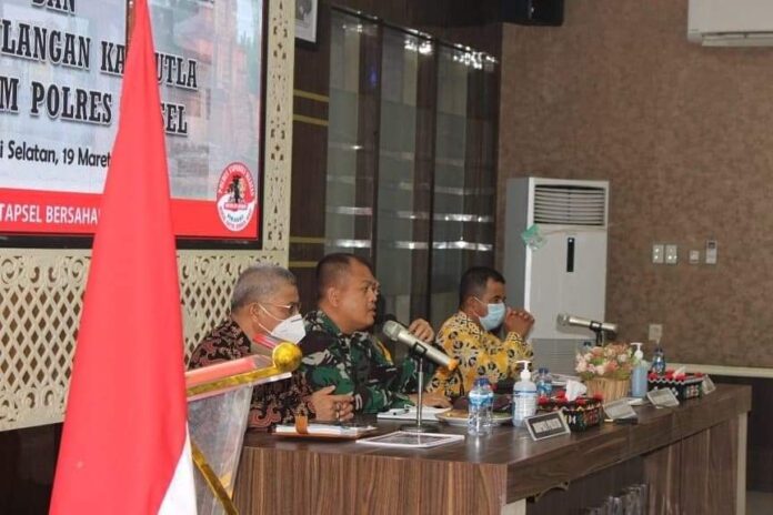Rakor dengan tetap mengikuti Protokol Kesehatan (Prokes) Pemerintah,dihadiri Bupati Tapsel diwakili Asisten I Setdakab Tapsel Hamdan Zen Harahap, SH, Kapolres Tapanuli Selatan AKBP. Roman Smaradhana Elhaj, SH, S.Ik, MH, Danyon Brimob Detacemen C Tapsel, Kalak BPBD Tapsel H. Ilham Suhardi, SH, Kadis Satpol PP Tapsel Zulkifli Harahap, para Kapolsek, Danramil dan Camat se Tapsel.