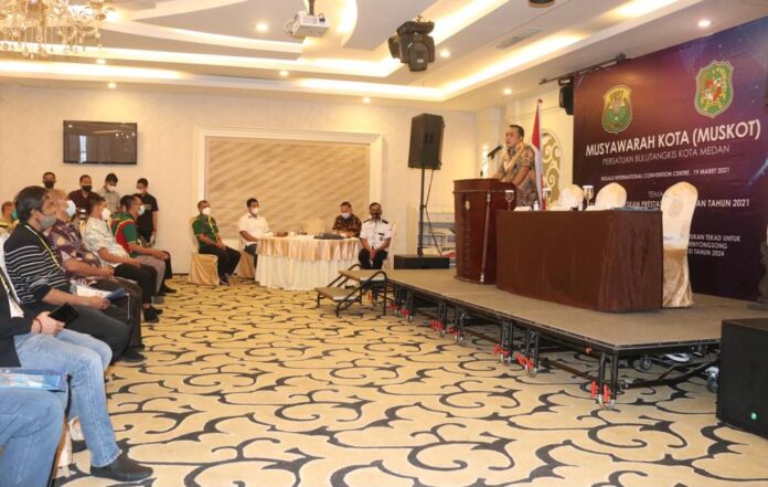 (Muskot) Persatuan Bulu Tangkis Seluruh Indonesia (PBSI) Kota Medan, Jumat (19/3/2021) di  Regale International Convention Center. Diharapkan Muskot ini dapat menghimpun dan menyatukan visi dan misi untuk memajukan dan meningkatkan prestasi atlet bulu tangkis Medan.