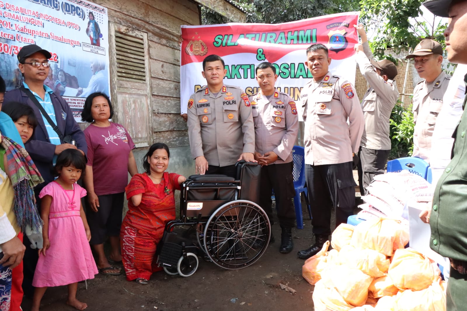 AKBP Ronald F.C Sipayung, menyerahkan secara langsung bantuan kursi roda dan paket sembako serta bantuan dana tunai kepada Rokaya Siregar sebagai ketua Pengurus Penyandang Disabilitas Indonesia (PPDI) Simalungun.