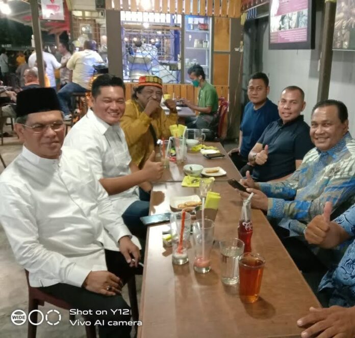 Terlihat juga pada posisi terpisah Senator Aceh Dr. Ir. H. Abdullah Puteh, M.Si bersama Dua anggota DPR-RI dari Dapil 2 Aceh, Ilham Pangestu dan Muslim SHi MM sedang “ngopi bareng” dengan Bakal Calon Walikota Langsa, Fazlun Hasan.