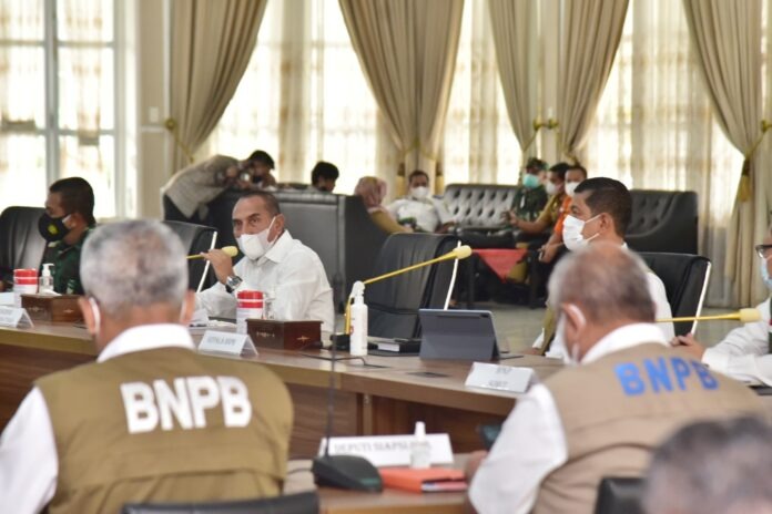 Turut hadir Plt Kepala BPBD Sumut Mahfullah Pratama Daulay dan Plt Asisten Pemerintahan dan Kesejahteraan Rakyat Afifi Lubis, tim dari Satgas Penanganan Covid-19. Selain itu juga hadir Forkopimda, OPD Pemprov Sumut dan Pemko/Pemda. (AL)