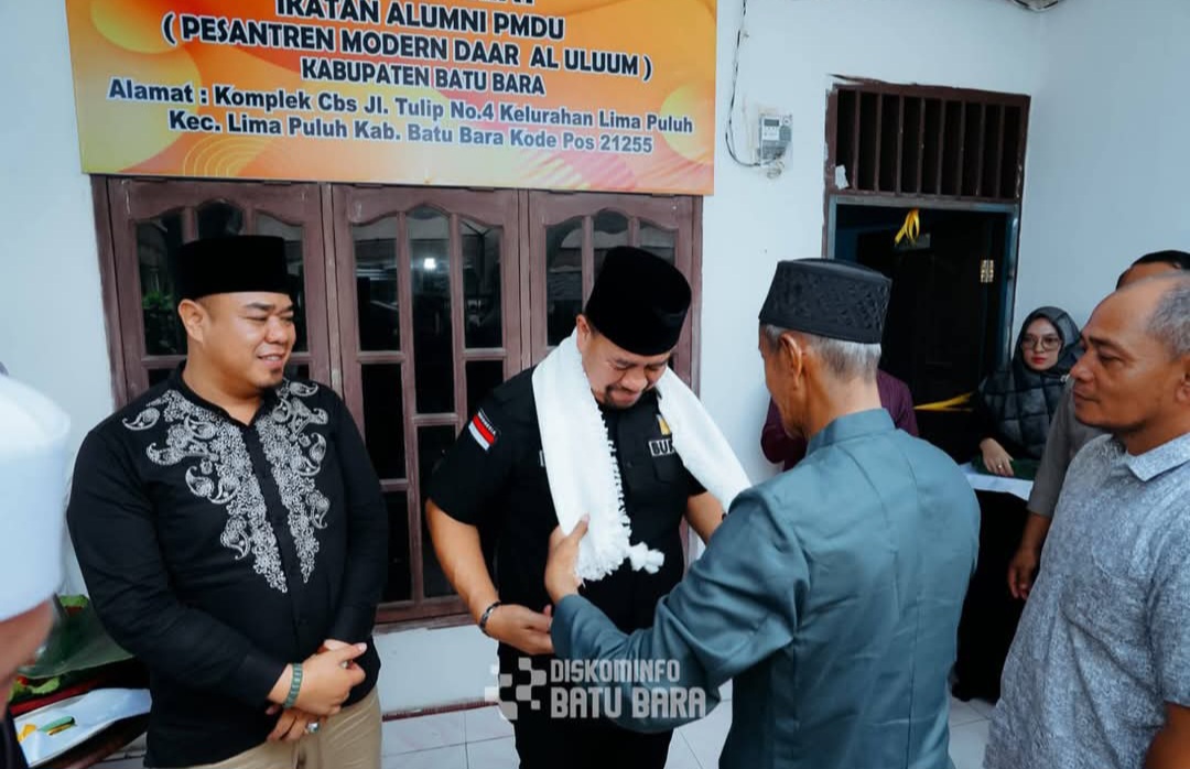 Lima Puluh — Dalam suasana penuh kehangatan dan kebersamaan, Bupati Batu Bara, H. Baharuddin Siagian, SH, M.Si, menghadiri acara Halal Bihalal sekaligus meresmikan Sekretariat Ikatan Alumni Pesantren Modern Daar Al Uluum (IKA PMDU) yang digelar di Komplek Perumnas Lima Puluh, Sabtu (19/04/2025).