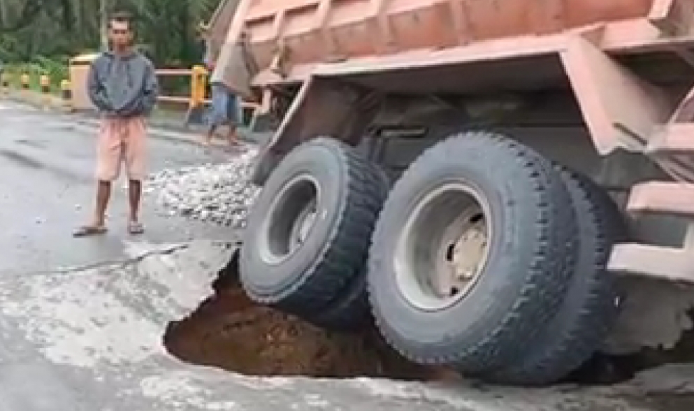 RIAU – Jembatan Jalan Lintas Timur di KM 57, Desa SP 5, Kabupaten Pelalawan, Riau tiba-tiba ambruk, Sabtu (19/9/2020) pukul 10.00 WIB. Atas kejadian itu, sebuah truk bermuatan batu kerikil terjebak di jembatan yang ambrol itu.