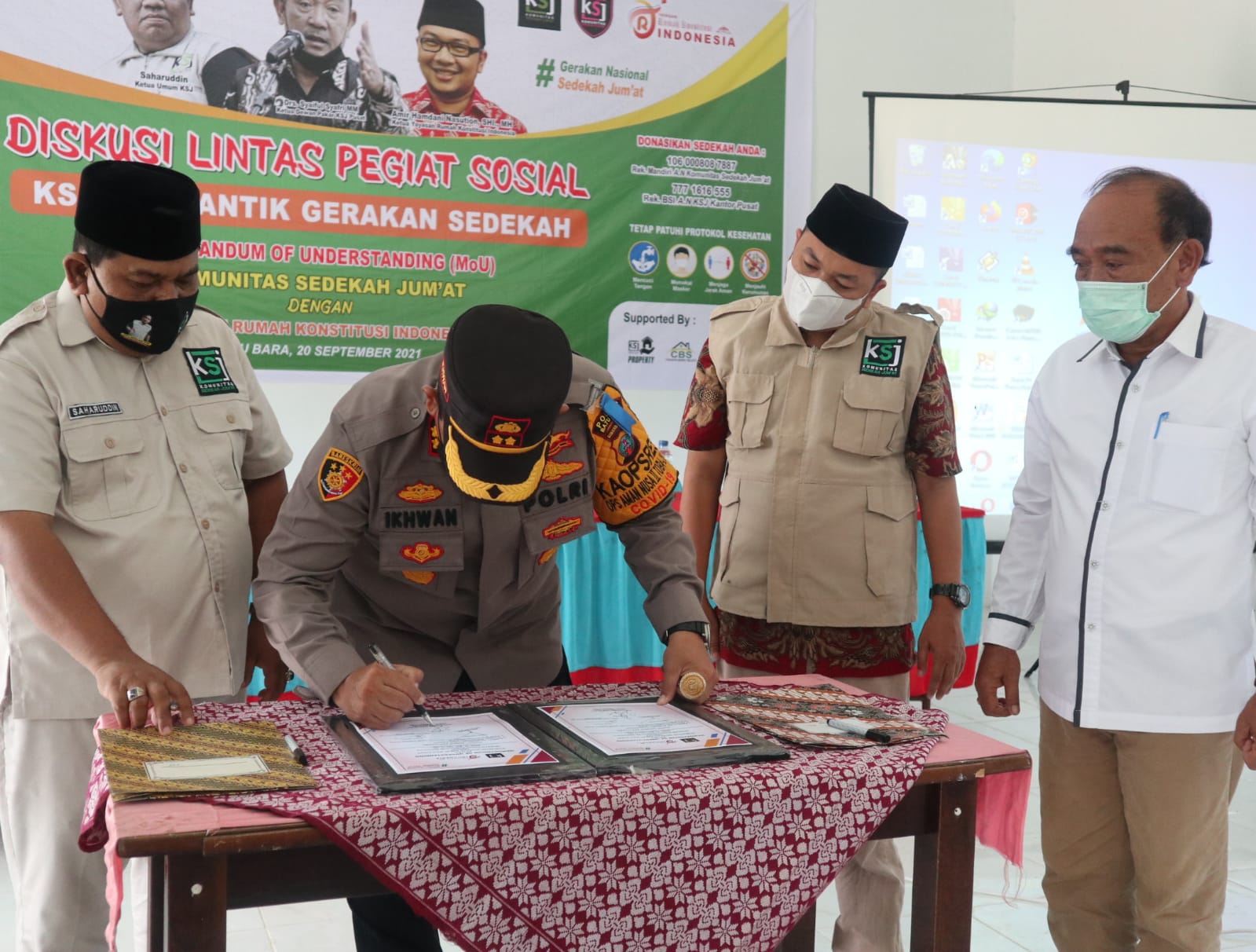 BATUBARA-Dihadiri Pembina dan Pendiri Komunitas sedekah Jumat (KSJ) AKBP Ikhwan SH.MH bersama Ketua Umum KSJ Saharudin SE dan Ketua Yayasan Rumah Konstitusi Indonesia  (YRKI) Amir Hamdani Nasution SH MH dilaksanakan Memorandum of Understanding (MoU) kedua organisasi sosial ini.