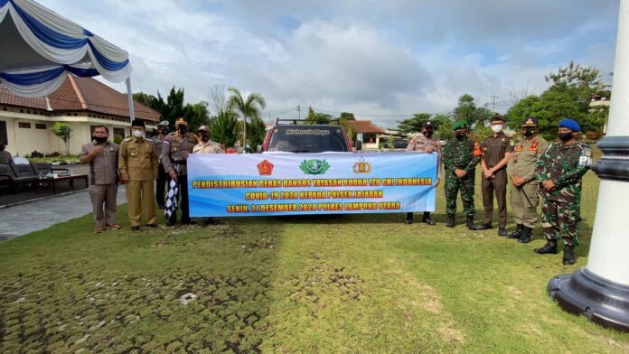 LAMPUNG UTARA – realitasonline.id | Polres Lampung Utara melalui Bhabinkamtibmas Polsek jajaran menyalurkan beras bantuan sosial dari Yayasan Buddha Tzu Chi Indonesia kepada masyarakat terdampak Covid-19 yang belum meneriman bantuan, Senin (21/12/2020).