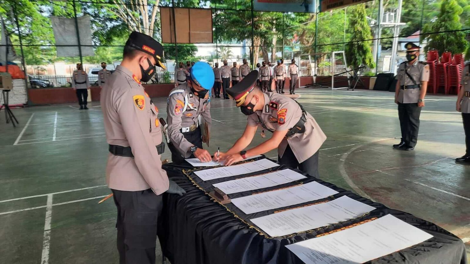 LANGKAT – Kapolres Langkat AKBP Danu Pamungkas Totok SH SIK pimpin Upacara Serah Terima Jabatan (Sertijab) 6 perwira di jajaran Polres Langkat yakni Wakapolres, Kasat Reskrim, Kabag Log, Kapolsek Gebang, Kapolsek Secanggang dan Kapolsek Besitang di Lapangan Bharadaksa Polres Langkat, Kamis (21/4/2022) sekira pukul 17.00 WIB.