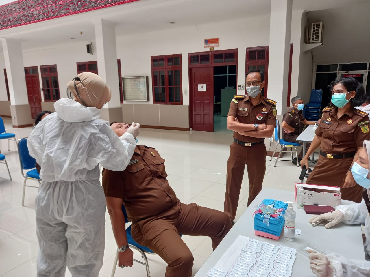 Pelaksanaan swab antigen Covid-19 di lingkungan kerja Kejati Sumut diikuti oleh Wakajati, para Asisten, Koordinator, staf dan pegawai serta pegawai honor. Dengan tetap mengedepankan penerapan protokol kesehatan dan seluruh petugas tenaga kesehatan menggunalan APD lengkap.