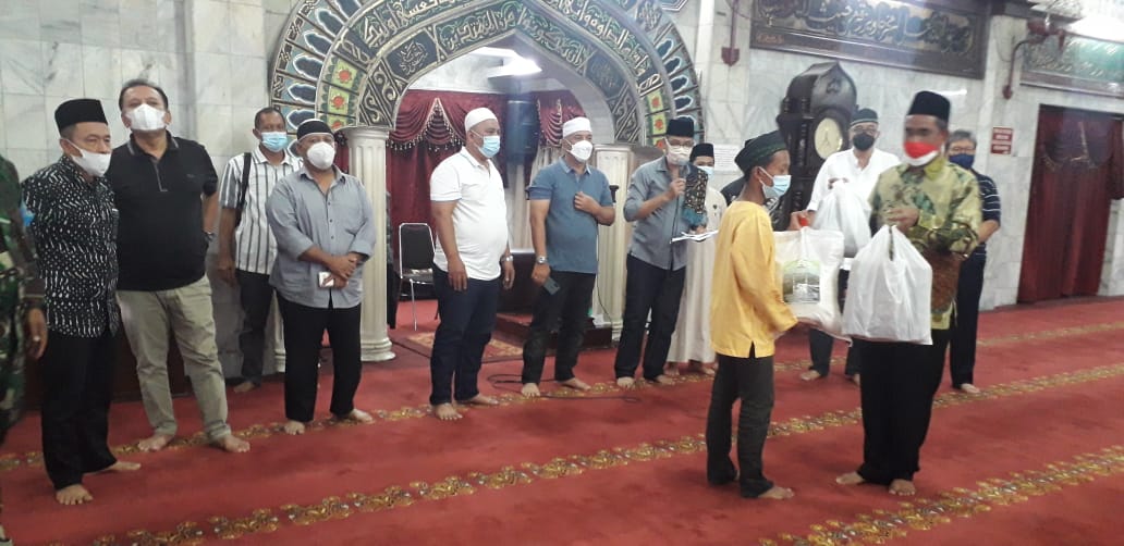 MEDAN— Berdoa agar pandemi Covid segera berlalu, Badan Kesejahteraan Masjid (BKM) Agung Medan menyalurkan bantuan sosial (bansos) kepada 200-an anak yatim usai Shalat Ashar dan bermunajat bersama di masjid ikonik tersebut, Sabtu (21/8).