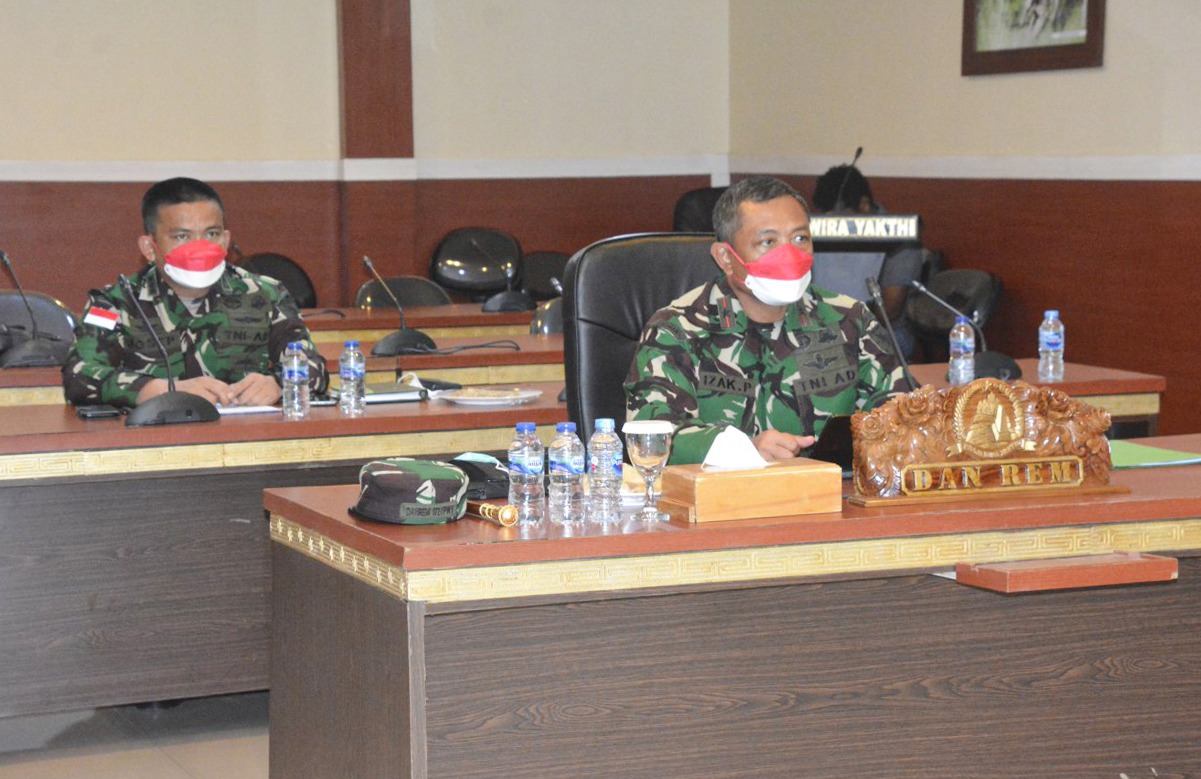 JAYAPURA-Komandan Korem (Danrem) 172/PWY Brigjen TNI Izak Pangemanan didampingi Kasiops Kasrem 172/PWY Kolonel Inf Josep D.D. Surbakti, S.E., mengikuti rapat koordinasi Evaluasi PPKM dan Penanganan Covid-19 di luar Jawa – Bali secara virtual, bertempat di Aula Makorem 172/PWY, Sabtu (21/8/2021).