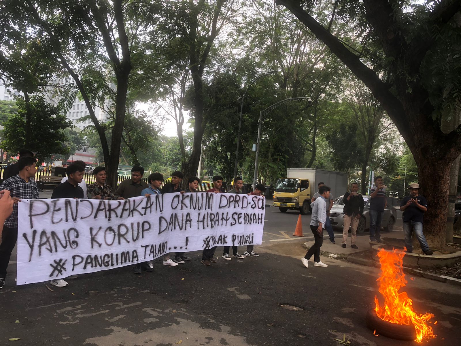 “Kami juga meminta agar Kejatisu memanggil dan memeriksa 17 kepala/pimpinan sekolah/yayasan yang telah menerima Bantuan Dana Hibah sebesar kurang lebih Rp200 juta per satu sekolah dari APBD Provsu TA 2021 – 2022. Dan melakukan pendalaman terkait dugaan tindak pidana korupsi bermodus pungli bantuan dana hibah sekolah/yayasan tersebut,” teriak para pendemo.
