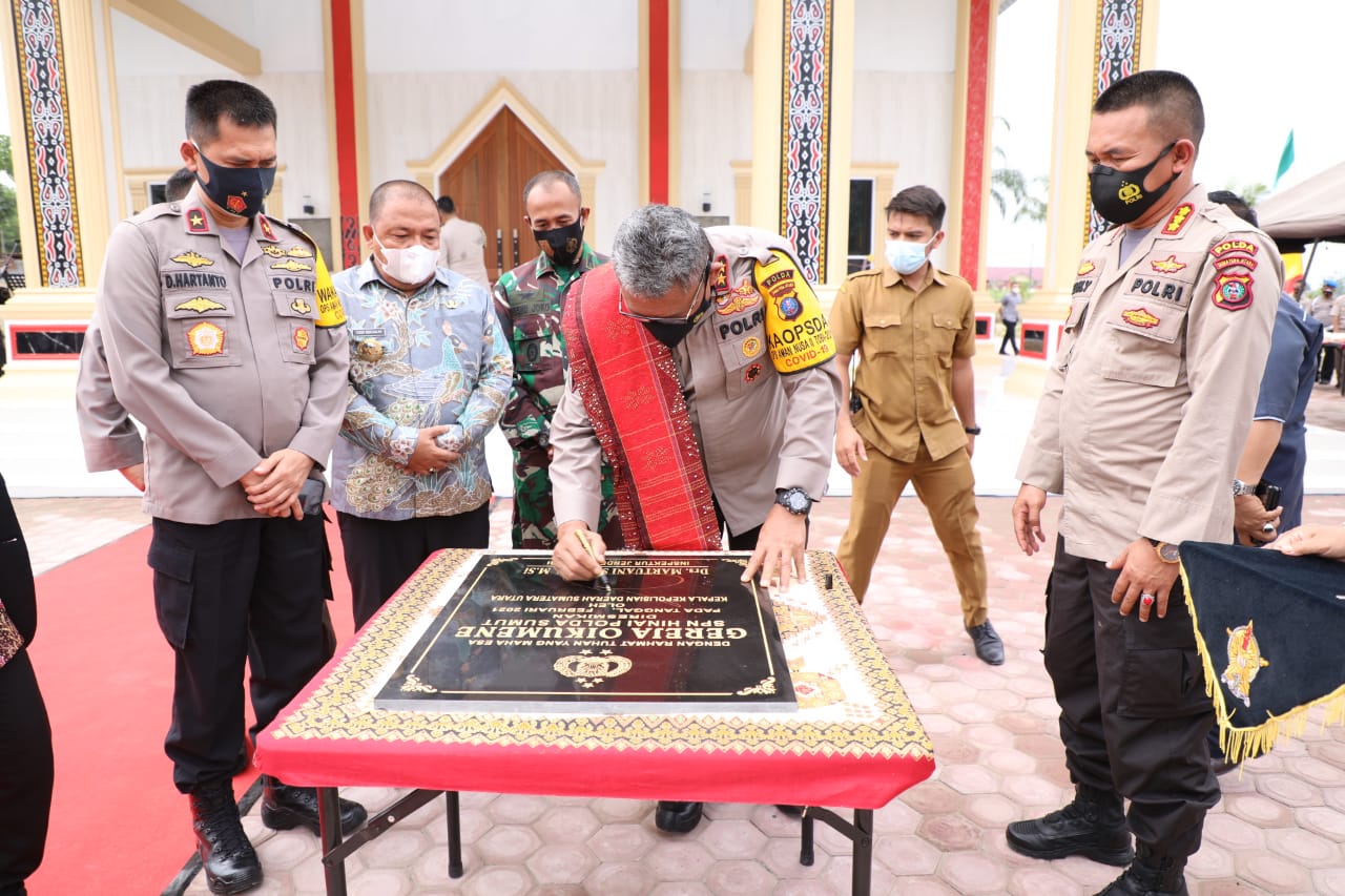 LANGKAT – Pembangunan Gereja Oikumene yang berada di Sekolah Polisi Negara (SPN) Hinai, Kabupaten Langkat, telah selesai dikerjakan dan diresmikan, pada Senin (22/2/2021). Peresmian Gereja Oikumene SPN Hinai itu ditandai dengan penandatanganan prasasti oleh Kapolda Sumut Irjen Pol Martuani Sormin didampingi Bupati Langkat Terbit Rencana, Waka Polda Sumut Brigjen Pol Dadang Hartanto, Ketua DPRD Langkat serta Para PJU Polda Sumut.