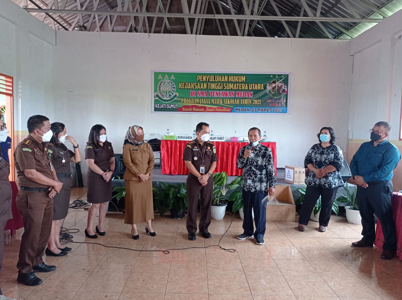 MEDAN-Penerangan Hukum Kejaksaan Tinggi Sumatera Utara (Kejati Sumut) menggelar acara Penyuluhan Hukum dalam program Jaksa Masuk Sekolah di Yayasan Pendidikan SMA Pencawan, Jalan Bunga Ncole Medan, Selasa (23/3/2021) mengusung tema ‘Kenali Hukum, Jauhi Hukuman’ diikuti hanya 20 orang siswa-siswa dan mengedepankan penerapan protokol kesehatan.
