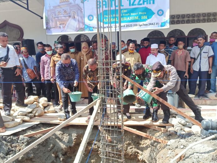 Usai memberikan arahan dalam acara tersebut, Bupati Akmal Ibrahim didampingi Ketua DPRK Abdya Nurdianto, Dandim 0110/Abdya Letkol Inf Arip Subagiyo, Kajari Abdya Nilawati SH MH dan mewakili Kapolres Abdya, AKBP Sulaiman beserta unsur terkait lainnya melakukan peletakan batu pertama secara bersama di pondasi tanda jadinya berdiri mesjid dambaan masyarakat setempat.