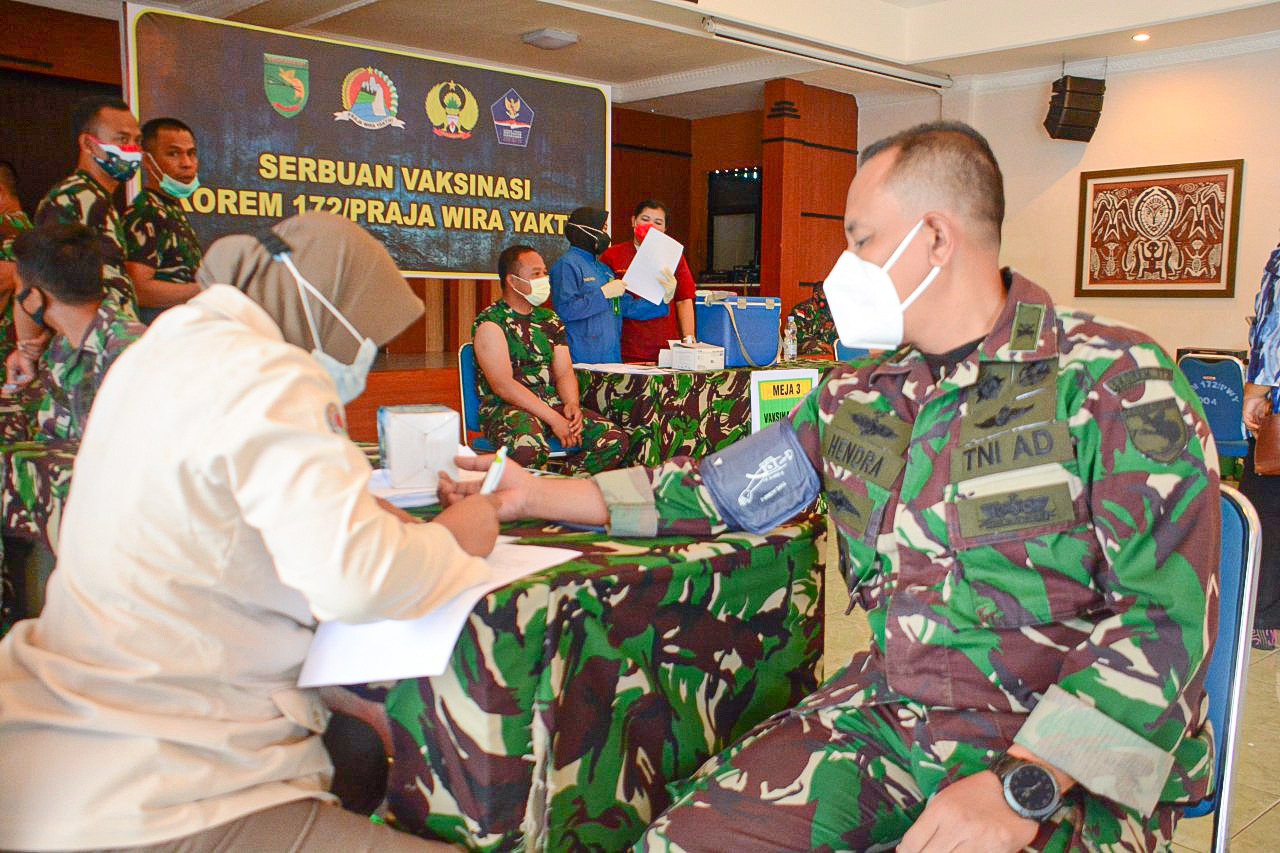 Untuk prajurit dan PNS dilingkungan Korem 172/PWY beserta personel Denzipur X/KYD yang mengikuti vaksinasi Covid-19 tahap dua sebanyak 598 orang. Jumlah tersebut sama dengan jumlah personel yang melaksanakan vaksinasi tahap satu.