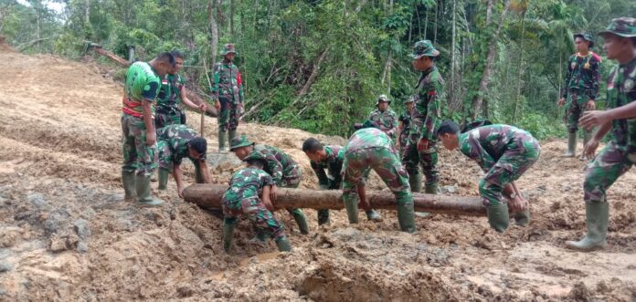 Proses pembangunan jalan antardesa yang dilengkapi sebuah jembatan darurat, akan sulit rampung secepat ini andai saja warga setempat tidak ikut membantu dan berjibaku bersama personel Satgas.