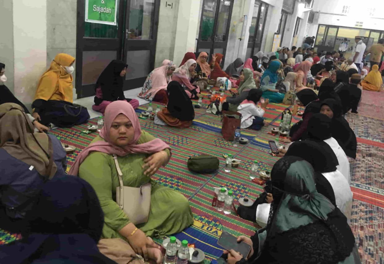 Suasana tersebut membuat pelataran teras depan Masjid yang telah ditata baik dan rapi dipenuhi jamaah yang duduk lesehan, berbaris, bersila berhadap-hadapan. Di hadapan masing-masing jemaah sudah terhidang penganan berbuka atau takzil.