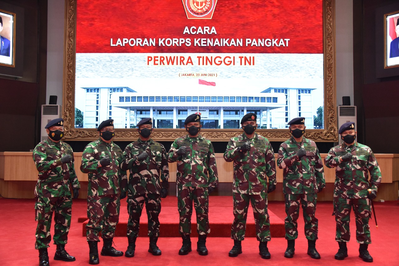 Laporan Korps kenaikan pangkat 30 Perwira Tinggi TNI berlangsung di Aula Gatot Subroto, Markas Besar TNI, Cilangkap Jakarta Timur diterima langsung oleh Panglima TNI Marsekal TNI Hadi Tjahjanto dalam suatu upacara.